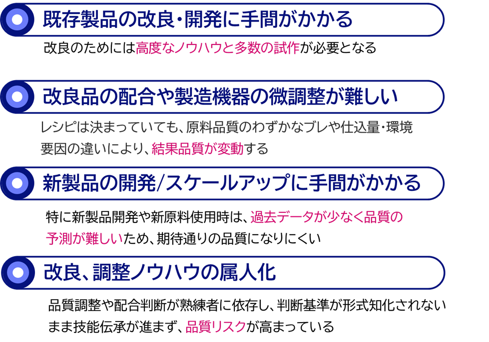原料ロット差や環境条件を加味した予測により、結果品質のブレを抑制し、